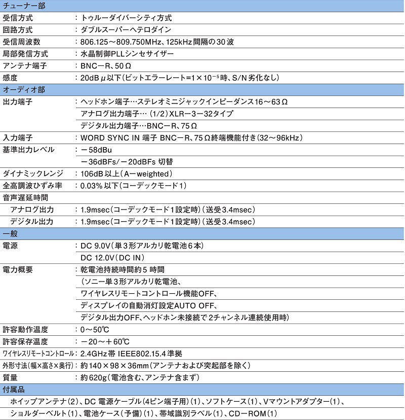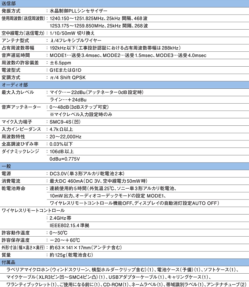 | 「WX-TB840or841(TX)×1」「WX-RJ700(RX)×1」) 使用時間:[TX]約14時間(単3×2) [RX]約10時間(単3×4) | |