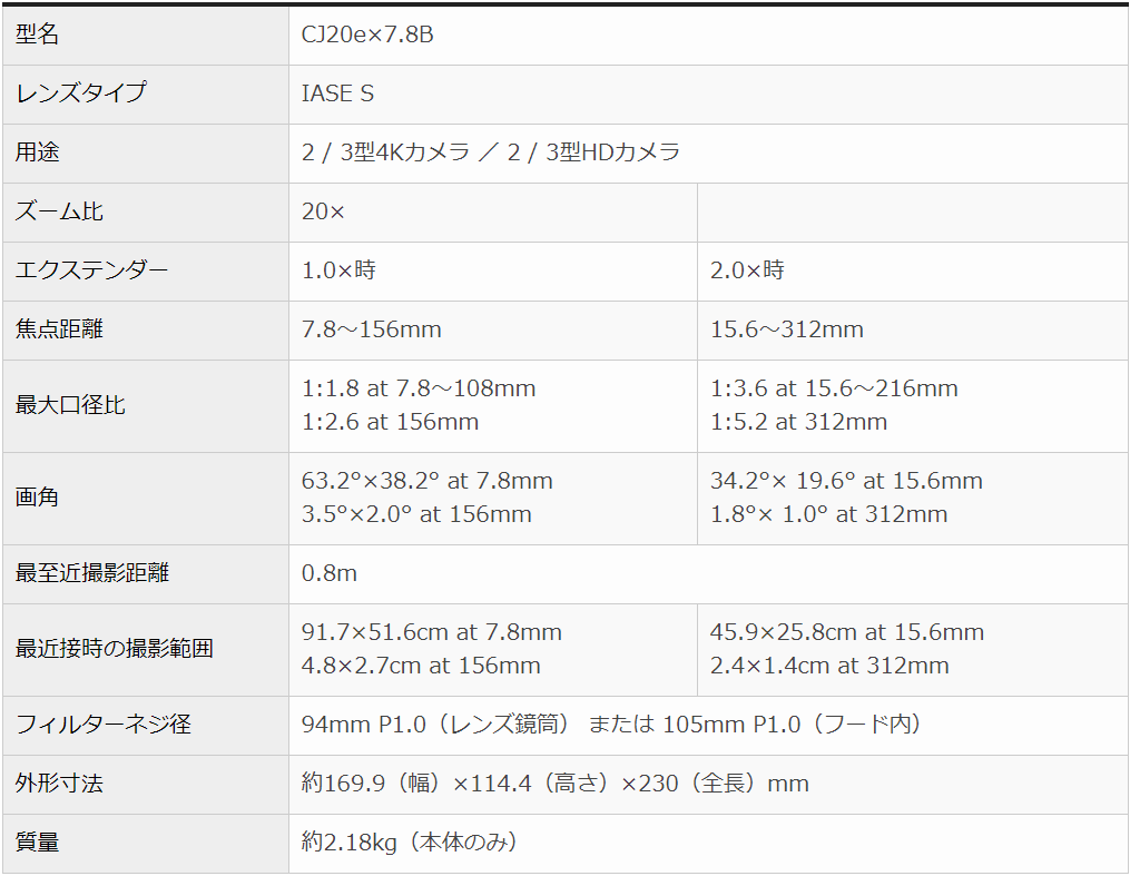 | 22倍 8mm-176mm フォーカスサーボ装備 4K Plus Premierシリーズ | |